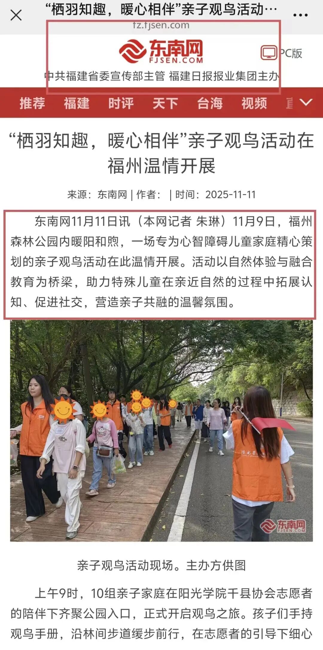 11月9日,在阳光学院通识教育学院的组织下,通识教育学院苏婧娴老师带领团队联合福州市民政局、共青团福州市委员会、福州市鼓楼区民政局、鼓楼区未成年人救助保护中心、温泉街道河东社区、福州市小桔灯社会工作服务中心共同开展“栖羽知趣·亲子观鸟”活动第五期,并获东南网报道。