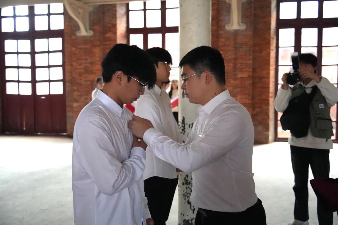 颁发礼阳光学院团委庄维扬老师逐一为新团员颁发并佩戴团徽。一枚枚闪亮的团徽郑重地佩戴在胸前,这既是对百年共青团光荣历史的传承,也是一份沉甸甸的责任寄托。它激励着新团员们以青春之名,践行入团誓言,将信仰熔铸于心,将责任付诸于行。