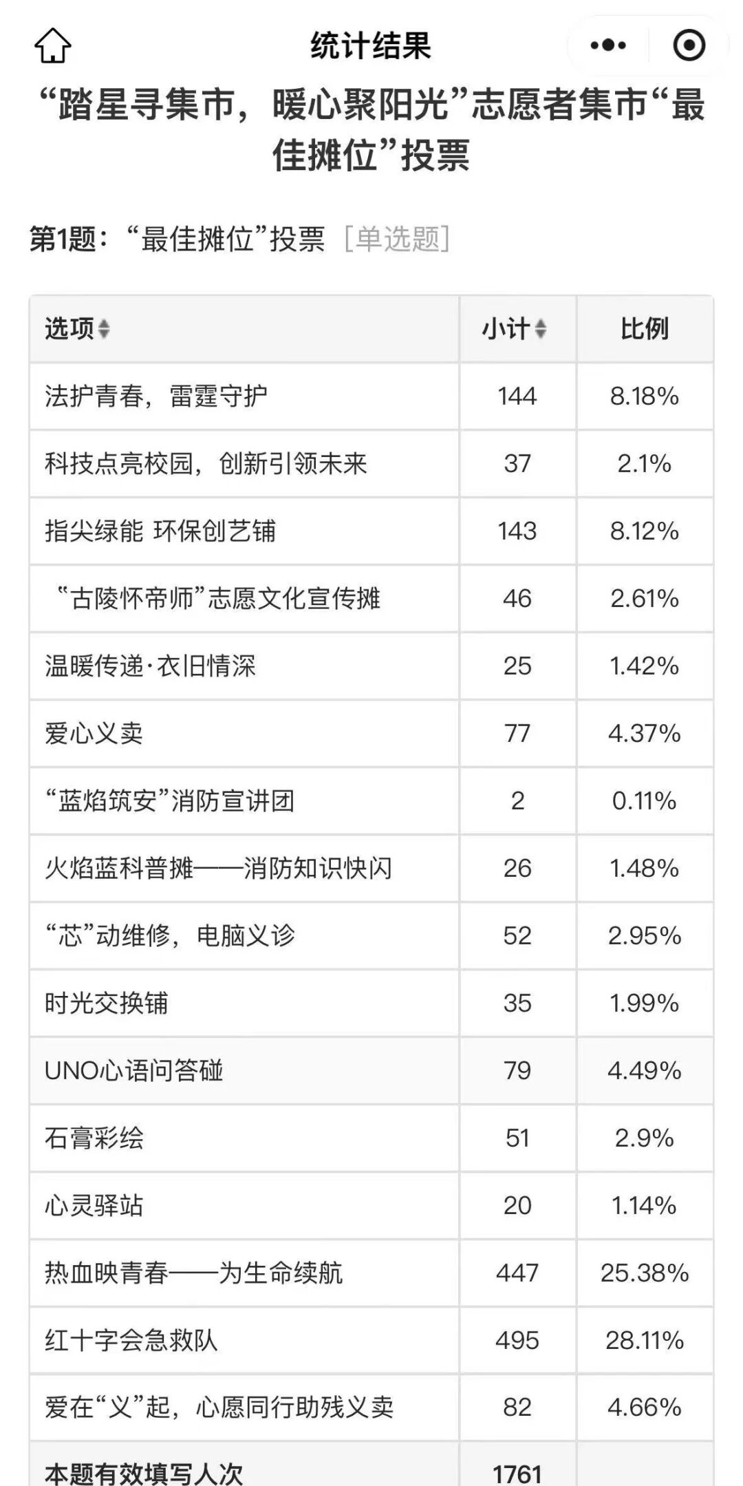 通过现场投票,“最佳摊位”评选结果正式揭晓。本次活动共收到1761份有效投票,各摊位得票情况如下: