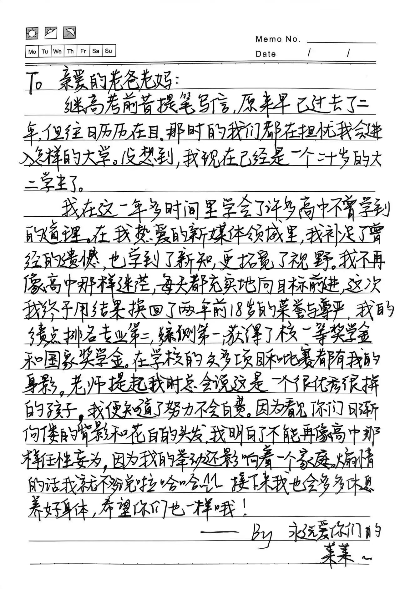 这是收到录取通知书时留下的一张照片。拆到一半的时候,下意识地先递给了父亲。 他看得极慢,半晌没说话,只是用他宽厚的手掌,在我后背上一下一下地拍着。 我转过头,看见母亲正低头反复擦拭着茶几上并不存在的灰尘,再抬眼时,眼角有着细碎的光。我知道它代表着一个夏天的落脚处,为那个躁动不安的夏天,找到了一个确切的、可以安放的归宿。最后,我想对父母说“爸,妈,你们以后可以省点心了,谢谢你们!”