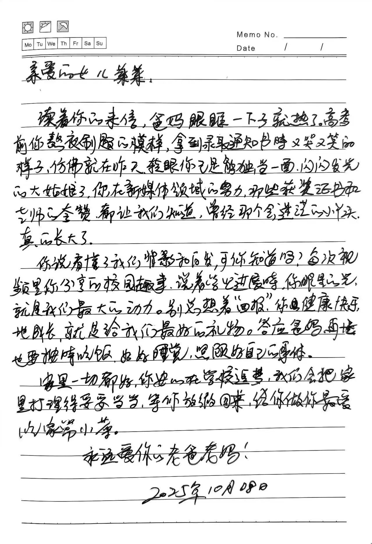 爸妈,离家求学的日子里,我才更懂你们目送我时的牵挂。看着你们眼里的骄傲与不舍,我知道你们的爱一直都在身边。在大学里,我会带着你们的期许好好读书、好好生活。每次回家,都要像这样,咱们仨挤在这沙发上,说说我在学校的趣事,听听你们的日常。你们的爱,是我在异乡最坚实的后盾,我们的故事,也会在我求学的时光里继续温暖书写。