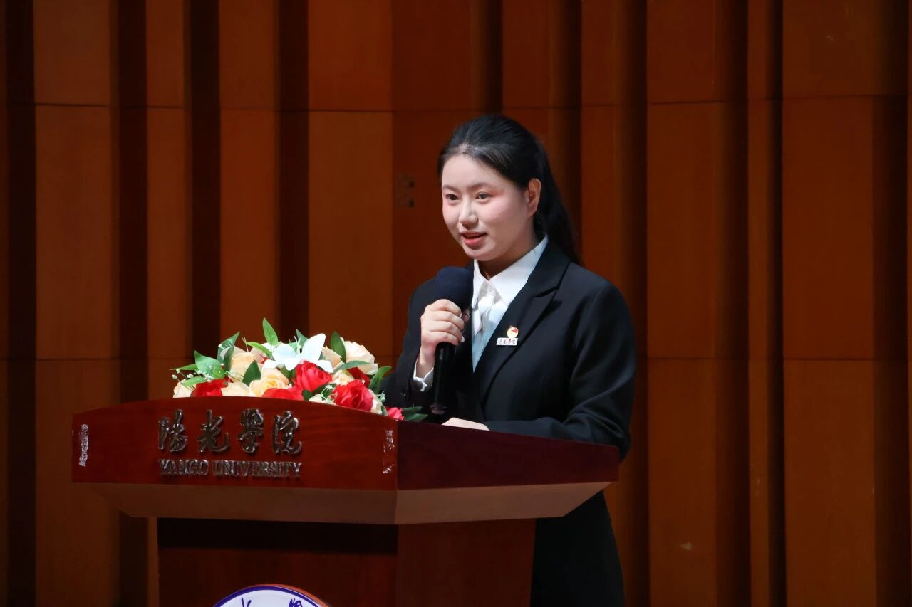 2024级音乐学1班刘湘玉作为学生代表发言,她分享了大一志愿实践的成长经历,直言这份迟来的军训让自己倍感珍惜。她结合闽西龙岩的红色记忆,讲述松毛岭战壕、革命旗帜等故土印记,传递红色精神力量。刘湘玉号召同学们将“明德弘毅,乐学善行”的学风与军人作风相融,在军训中锤炼意志。她表示,14天的军训虽短,却能埋下终身受益的成长力量,那些在训练中磨砺的执着与团结,终将成为未来直面挑战的底气,让“请党放心,强国有我”的誓言铭刻青春。