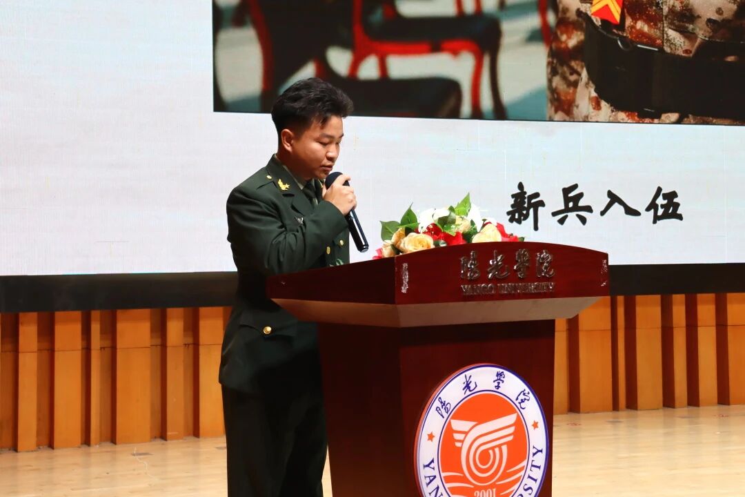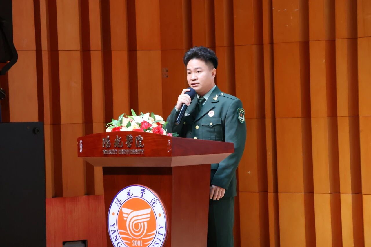 庄达誉以自身经历为2024级的同学们带来励志分享。他讲述了从地方青年蜕变为合格军人的两年历程:叠"豆腐块"被子磨平心性、武装拉练体会团结坚持、站岗执勤领悟责任担当等点滴故事,诠释了部队对细节与高标准的追求。重返校园后,他深切感受到学校的关怀与温暖。分享中,他号召青年一代传承坚韧品格,接过强国接力棒,以"打好底色、提高成色、努力出色"的信念面对考验,喊出"请党放心,强国有我"的青春誓言,也希望同学们能在14天的军训中学会坚持、懂得协作,将军训收获转化为未来成长的力量,在青春赛道上勇毅前行。
