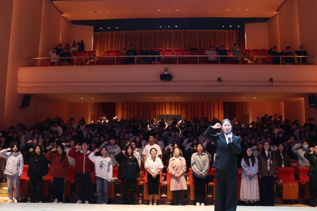 随后由刘湘玉同学作为代表带领全体同学起立举拳,以“服从命令、听从指挥,尊重教官、刻苦训练,扬昂扬斗志、为学院争光”的铿锵誓言凝聚共识,坚定的声音回荡在音乐厅,展现出同学们迎接挑战的决心与豪情。