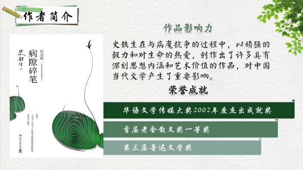 史铁生的《病隙碎笔》,讲述作者坐在轮椅上思考生命,文字里没有抱怨,满是温柔。