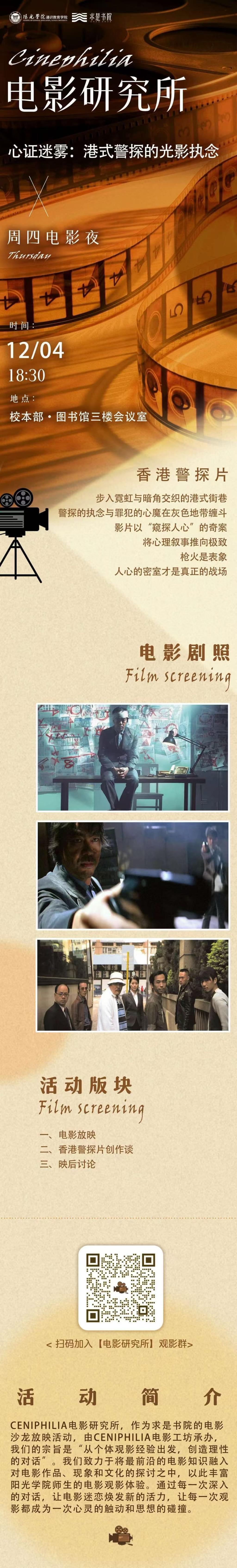 CENIPHILIA电影研究所,作为求是书院的电影沙龙放映活动,由CENIPHILIA电影工坊承办,我们的宗旨是“从个体观影经验出发,创造理性的对话”。我们致力于将最前沿的电影知识融入对电影作品,现象和文化的探讨之中,以此丰富阳光学院师生的电影观影体验。通过每一次深入的对话,让电影迷恋焕发新的活力,让每一次观影都成为一次心灵触动和思想的碰撞。